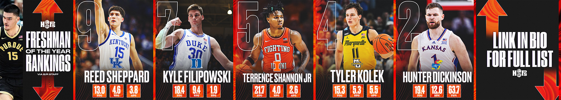 For the Hoops brand, I focused on social media content, creating a set of small templates as well as the large “Freshman of the Year” rankings slider. These assets provided flexible tools for real-time posting while maintaining a consistent and dynamic visual style across platforms. My work supported engaging, on-brand content tailored for basketball audiences.